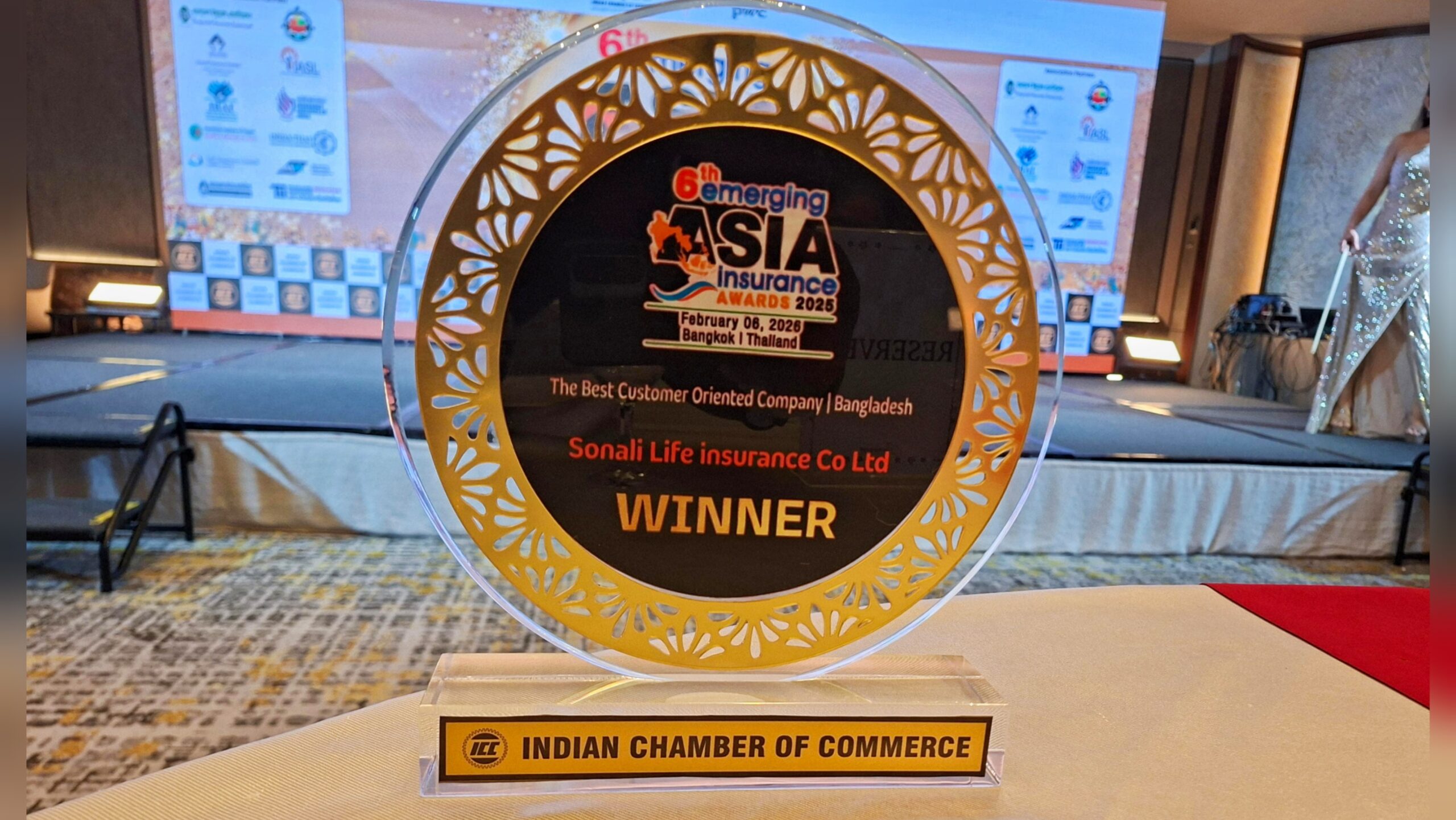 গত বৃহস্পতিবার (৬ ফেব্রুয়ারি) ব্যাংককে Indian Chamber of Commerce আয়োজিত এই অনুষ্ঠানে বিভিন্ন দেশের শীর্ষস্থানীয় বীমা প্রতিষ্ঠানগুলোর অংশগ্রহণে পুরস্কার প্রদান করা হয়।